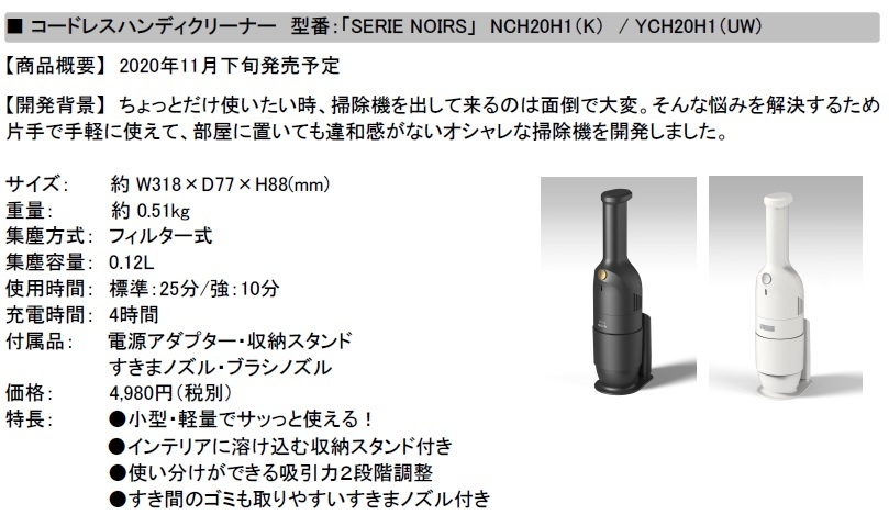 株式会社ヤマダホールディングスは、2020年11月下旬以降順次、「ヤマダセレクト」コードレスハンディクリーナー2機種を全国のヤマダデンキ店頭(一部店舗を除く)、および当社インターネットショップ(ヤマダウェブコム)にて発売開始致します。