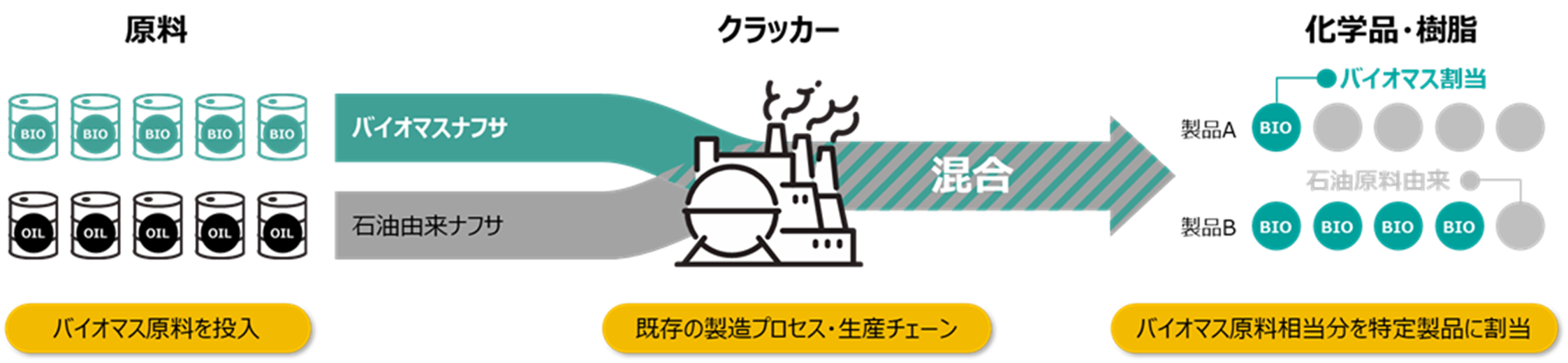 「原料から製品への加工・流通工程において、ある特性を持った原料(例:バイオマス由来原料)がそうでない原料(例:石油由来原料)と混合される場合に、その特性を持った原料の投入量に応じて、製品の一部に対してその特性の割り当てを行う手法」(環境省バイオプラスチック導入ロードマップ)を言います。