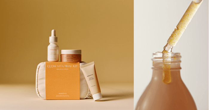 基礎化粧品を新たに購入する時、自分の肌に合うかどうか不安になる方は多いはず。そこで「AROMATICA」では、肌との相性が特に気になるビタミンCとスクラブアイテムに着目。ビタミンCセラム(美容液)とフェイシャルスクラブ、さらにナイトクリームのミニサイズをセットにした「グロービタトライアルキット」を企画しました。