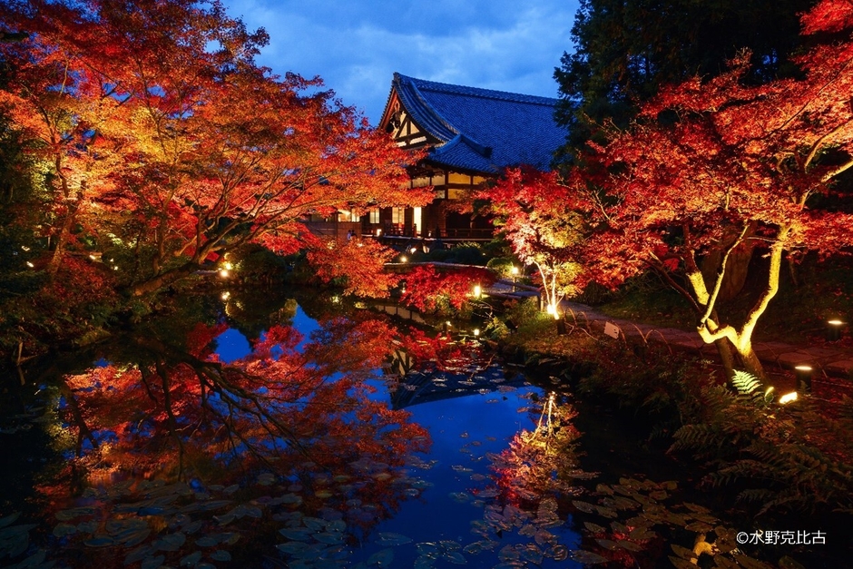 紅葉が美しいライトアップされた「紫雲の庭」の水面に映る逆さ紅葉は必見です。