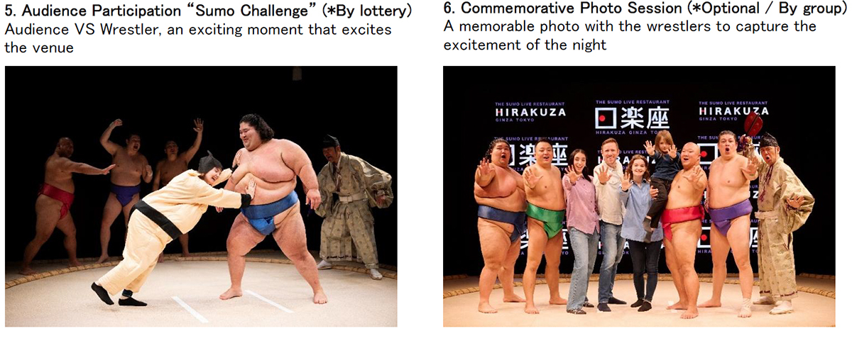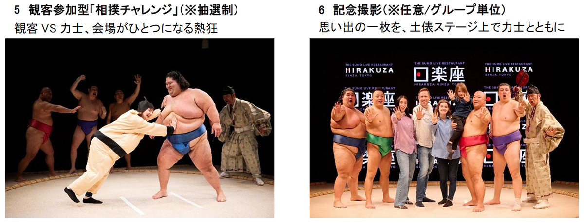 「THE SUMO LIVE RESTAURANT 日楽座 GINZA TOKYO」では、力士の稽古の様子や寄せ太鼓の演出、土俵祀りや化粧まわしをつけた土俵入りなどのリアルを表現することで、相撲の歴史を一層体感できる公演とします。また、食文化を公演項目の一部とし、“GINZA”ならではのこれまでにない文化体験を提供することもポイントです。