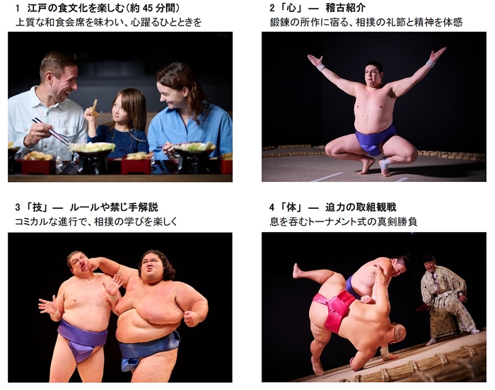 2時間の公演プログラムは、和食会席から始まり、「心」稽古紹介→「技」ルール解説→「体」取組観戦→観客参加型「相撲チャレンジ」→記念撮影へとシームレスに展開。演出には音、光、映像を駆使し、土俵ステージを中心に、ダイナミックな空間を創出します。全編英語で進行することで、初めて相撲に触れる訪日観光客にもご堪能いただける内容になっています。