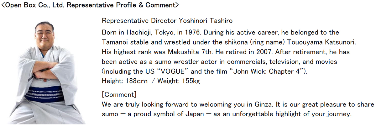 相撲の力強さと和食の美しさ、そして人の温かさが交わるこの空間から、日本の誇りある文化を世界中の人々へ届けてまいります。