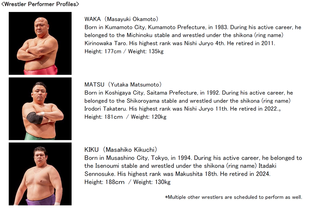 本公演プログラムは、相撲の力強さと美しさを際立たせる新しいステージ表現を追求し、相撲特化型芸能事務所「SUMO Agency(スモウ エージェンシー)」(運営:株式会社オープンボックス)と創り上げます。出演力士は、元大相撲力士を起用予定です。