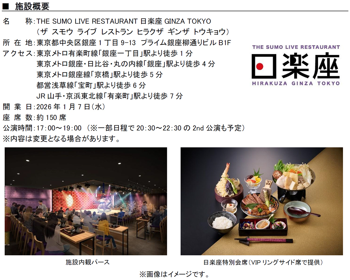 Building on the directorial expertise and operational track record cultivated at “THE SUMO HALL HIRAKUZA OSAKA” (which opened in May 2024), we will promote new ways to enjoy Japanese culture and the allure of sumo from Ginza to the world. Further details are provided on the following.