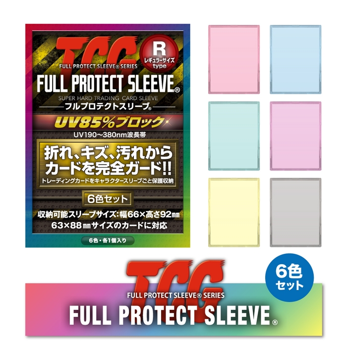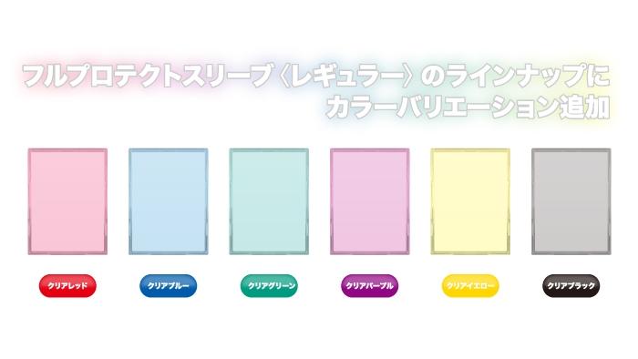 フルプロテクトスリーブカラーは6色展開!クリアレッド、クリアブルー、クリアグリーン、クリアパープル、クリアイエロー、クリアブラック。カードの属性別に選べるカラー展開です。
