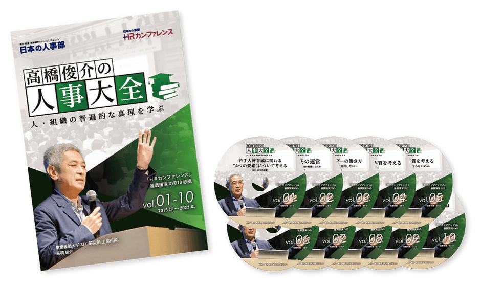 講演に対する、参加者の皆さまの満足度はとても高く、高橋氏にはその後幾度も「HRカンファレンス」にご登壇いただきました。毎回、違うテーマでかつ一貫性のある講義内容。大変多くの皆さまからいただいた「何度も視聴して学び直したい」とのご要望にお応えし、このたび過去10回分の映像をDVDに収録し、皆さまにお届けしたいと考えました。いつまでも色あせない講演をご堪能ください。