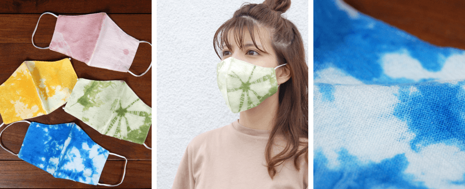 今年流行のタイダイ柄は全4色のラインナップ。手染めで鮮やかに染色されているためひとつひとつデザインの表情の変化が楽しめます。なお、内側はガーゼ仕様・個包装されているので安心してご利用いただけます。