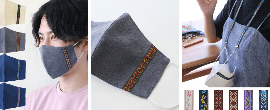 また、タイ製のチロリアンテープをあしらったマスクには、同じデザインのマスク用ストラップもラインナップ。かわいい小花柄で色が控えめでエスニック感も抑えめなので、秋コーデにも合わせやすいデザインです。