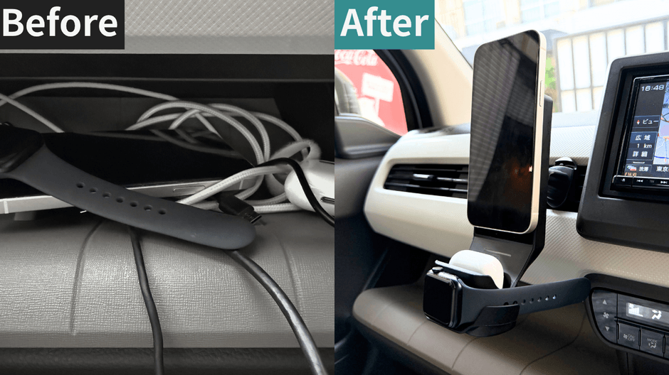 こうした課題を解決すべく、3台同時に置くだけで充電でき、配線の煩わしさもなく、車内空間をスッキリ保てる新しいソリューションとして、“移動しながらでも安全かつ快適に”という日常の悩みに応えました。