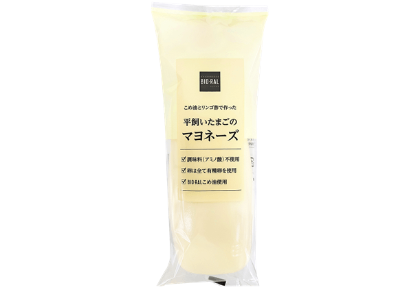 BIO-RALの人気商品「こめ油」と有精卵の平飼いたまご、リンゴ酢を使用したこだわりのマヨネーズ。