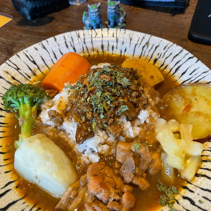 国産地鶏と野菜の旨味がギュッと詰まったスパイスカレーと蒸し野菜はヘルシーなのにボリューミー。 山椒キーマとの合いがけでお出しします。そのままも良し! 混ぜるとなお良しの一皿です。