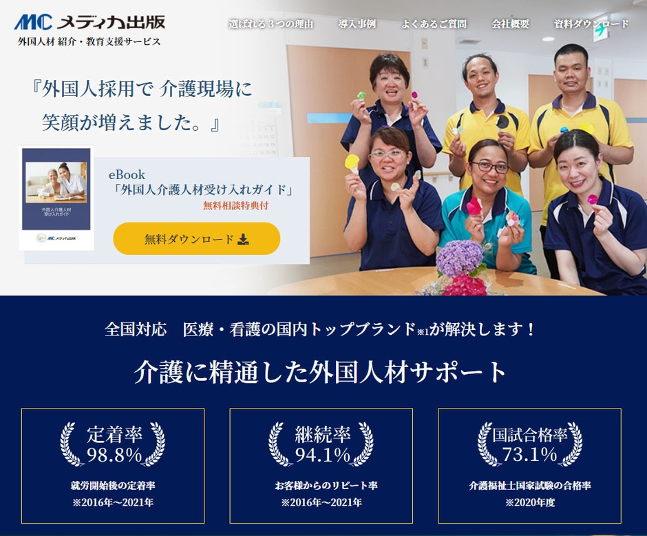 医師・看護師向けの出版教育事業を手がける株式会社メディカ出版(本社:大阪市淀川区、代表取締役社長:長谷川 翔)は、病院・介護事業者を対象とした外国人材の採用・教育支援サイトを2021年7月にリニューアルし、無料相談特典付きeBook「外国人介護人材受け入れガイド」の提供をはじめます。これまで要望の多かった導入事例の紹介や、各種受け入れルートとそのメリット・デメリットなどのポイントをまとめており、外国人の採用を検討するも踏み切れない施設が多いなか、確かな人材の育成や採用についての情報を提供することで、受け入れに対する不安や疑問を解消します。