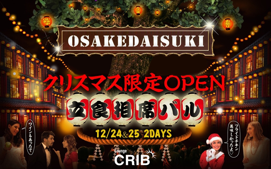 BBQが思う存分に貸切で楽しめるLounge CRIB(運営:株式会社SPICE SERVE、所在地:東京都港区、代表取締役社長CEO:山田 康平)は、2021年12月24日(金)・12月25日(土)のクリスマス限定で、男女の出会いを後押しする相席バル「OSAKE DAISUKI」を開催いたします。