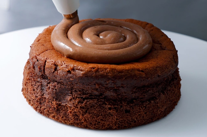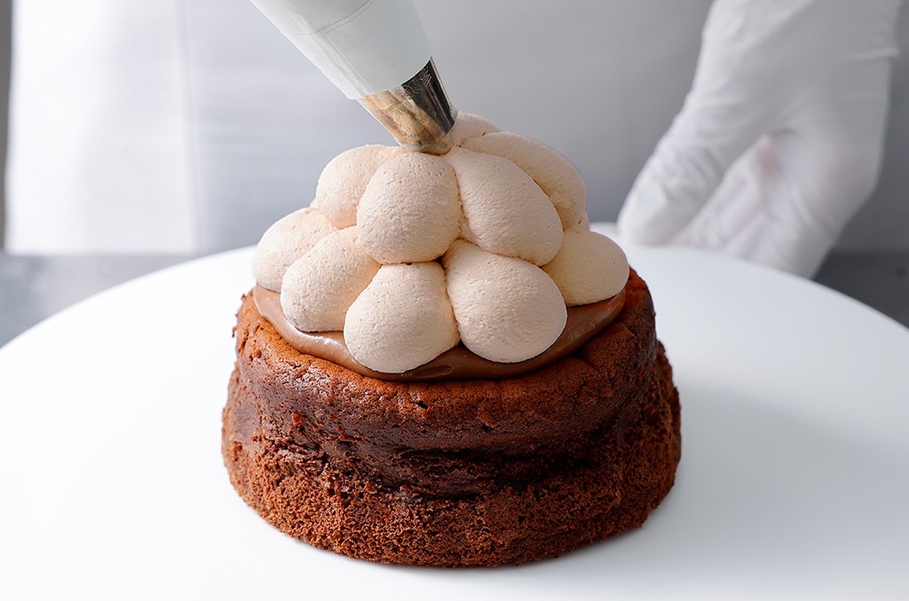 ガトーショコラの味わいに合わせて作った軽やかな生チョコクリームを丸くたっぷりと絞りました。
