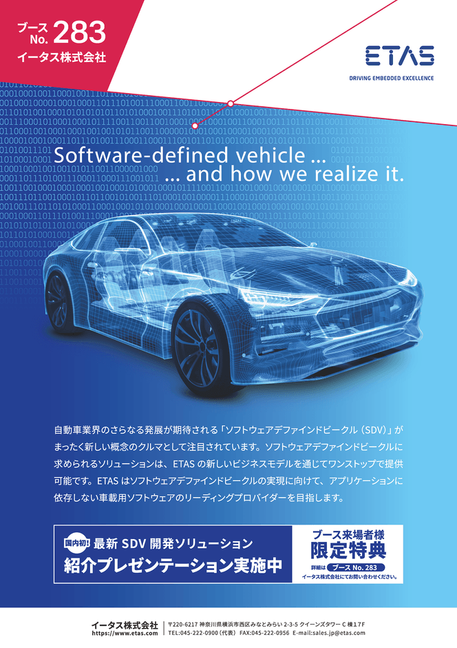 車載ソフトウェア開発ツールのETAS 「人とくるまのテクノロジー展 2022 横浜」出展のお知らせ 国内初SDVプレゼンテーションや開発中ソフトウェアを先行紹介