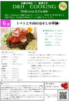 「Delicious(おいしさ)」と「Health(健康)」をコンセプトに、相愛大学人間発達学部管理栄養学科の学生(管理栄養士を目指す)が、料理研究家で同大学教授の杉山文氏の指導のもと、当社からの提案をもとに具体的なレシピ開発に取り組んでいます。開発したレシピは、売場内の専用コーナーにて配布し、お客様の日々の食生活に活かしていただける形で展開しています。