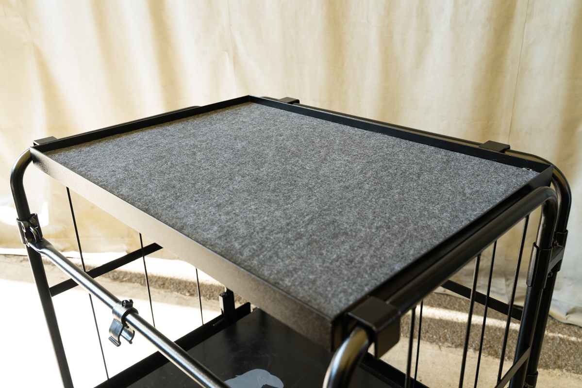 棚板「プレミアムシェルフ」は、高さのあるフチによって、細かい部品の落下を防ぎ、さらに滑り止めのカーペット仕様により、機材を安全に積載できます。現場では、移動式の作業台としても使用可能です。
