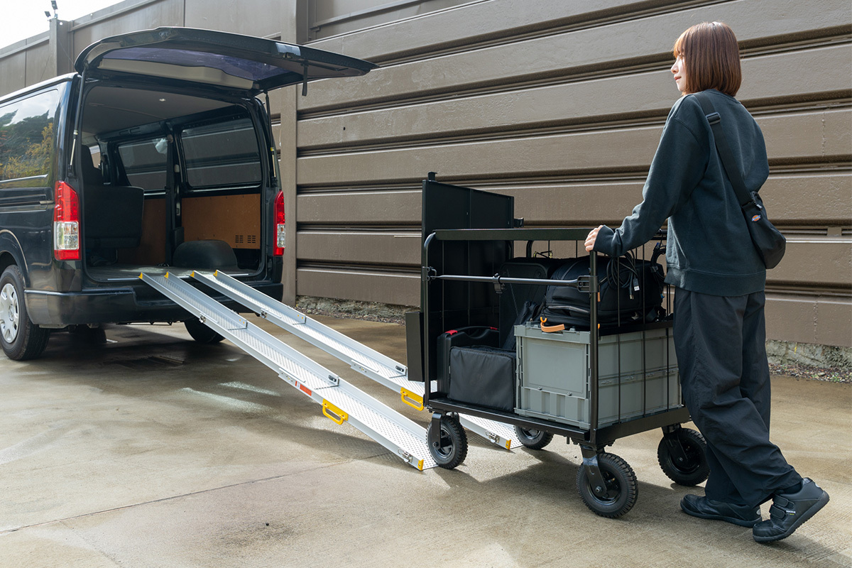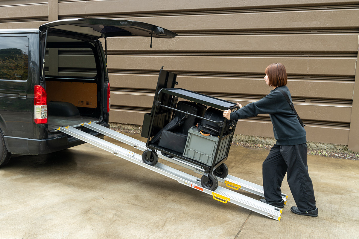 「クロウディ専用伸縮式スロープ」を使えば、機材を載せたまま積み込み・積み下ろしができます。