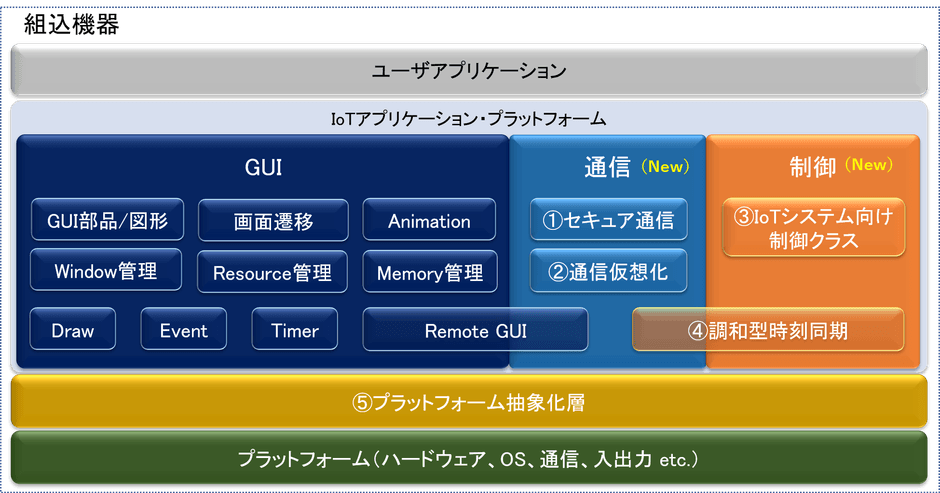 従来バージョンでは、組込GUIアプリケーションに必要な基本機能を集約したGUIプラットフォームを提供してきましたが、今回リリースする新バージョンではGUI基本機能に加えてIoT対応製品開発に必要な通信と制御に関する基本機能を統合したIoTアプリケーション・プラットフォームを提供します。