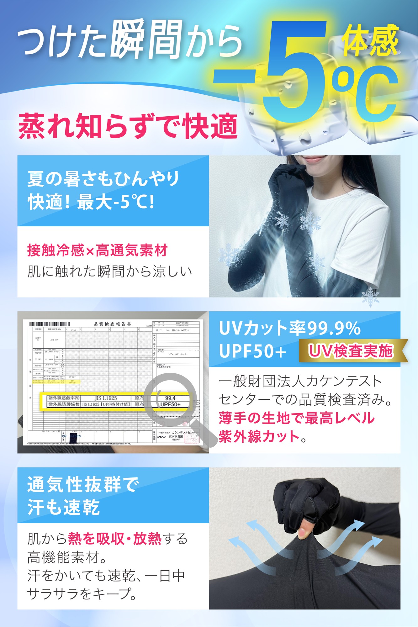 2.【マイナス5℃の冷感】ひんやり快適な瞬間冷感素材&優れた通気性