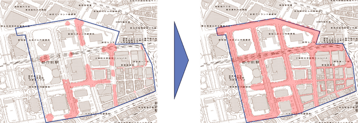 本技術のフィールドでの性能確認を目的に、東京都が推進する「つながる東京」展開方針(注2)の下、東京都と新宿区が保有する街路灯および地下出入口などに、合計22台の中継器を設置しました。本試験は2024年10月から実施し、西新宿地区の約600メートル四方の範囲において、既存のミリ波のカバー率と比較し、道路のカバー率を33%から99%に拡大したことを確認しました。