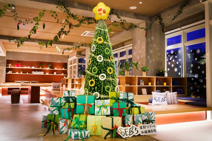 ゴーヤを丸々一本そのままツリーに仕立てたような、全長約2.5メートルのツリーがTAMARIBAに登場します。3色のゴーヤの輪切りのオーナメントや、ツリーの一番上には熟れて黄色くなったゴーヤの輪切りを模した星で装飾をした、ゴーヤだらけのクリスマスツリーです。間違えて食べてしまわないように要注意!