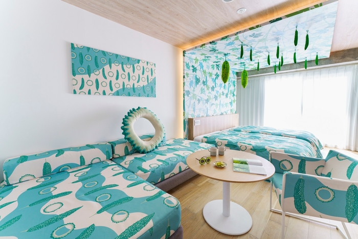 BEB5沖縄瀬良垣には、1室限定のユーモアたっぷりなゴーヤルームがあります。ゴーヤの輪切りの形をしたクッションやオリジナルルームウェア、ゴーヤサングラスなどを用意。さらに、ベッドの上にはゴーヤ枕が吊るしてあり、就寝前に自らゴーヤ枕をもぎ取るゴーヤ収穫も体験できます。ここに宿泊すれば、よりゴーヤクリスマス気分が盛り上がります。