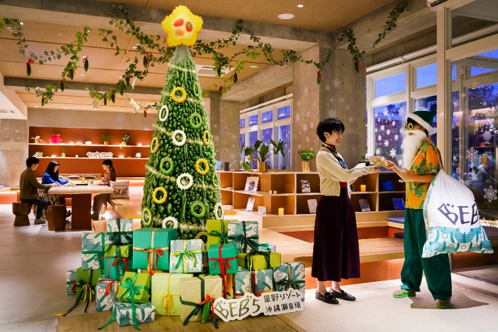 「居酒屋以上 旅未満」の体験を提供する「星野リゾート BEB5(ベブファイブ)沖縄瀬良垣」では、2022年12月1日~25日の期間、ゴーヤ尽くしのユニークなクリスマスが楽しめるイベント「BEBゴーヤクリスマス」を開催します。パブリックスペース「TAMARIBA(タマリバ)」にゴーヤを丸々一本そのままツリーに仕立てたような、全長約2.5mのツリーが登場し、クリスマスムードを盛り上げます。また、ゴーヤの輪切りを模したクリスマスケーキを販売。さらには、ゴーヤのアイテムを全身に身に着けたサンタが登場して、お菓子をプレゼント!ゴーヤ尽くしのユニークなクリスマスイベントです。