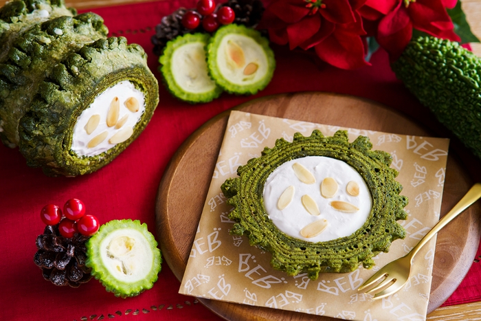 ゴーヤの輪切りを模したクリスマスケーキを、期間限定で販売します。あっと驚く見た目ですが、生地は抹茶味のバームクーヘンを使用し、南国を感じるパイナップルやマンゴ―などのフルーツと口当たりまろやかな生クリームと合わせています。見た目も楽しく、食べても美味しいクリスマスケーキです。