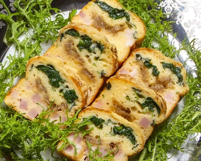 ふんわりと焼き上げた生地に、じゅわっと旨みの広がるベーコンと、香り豊かなきのこと旬の野菜のほうれん草をたっぷりと混ぜ込み、食べ進めるほどに味わいの変化を楽しめます。