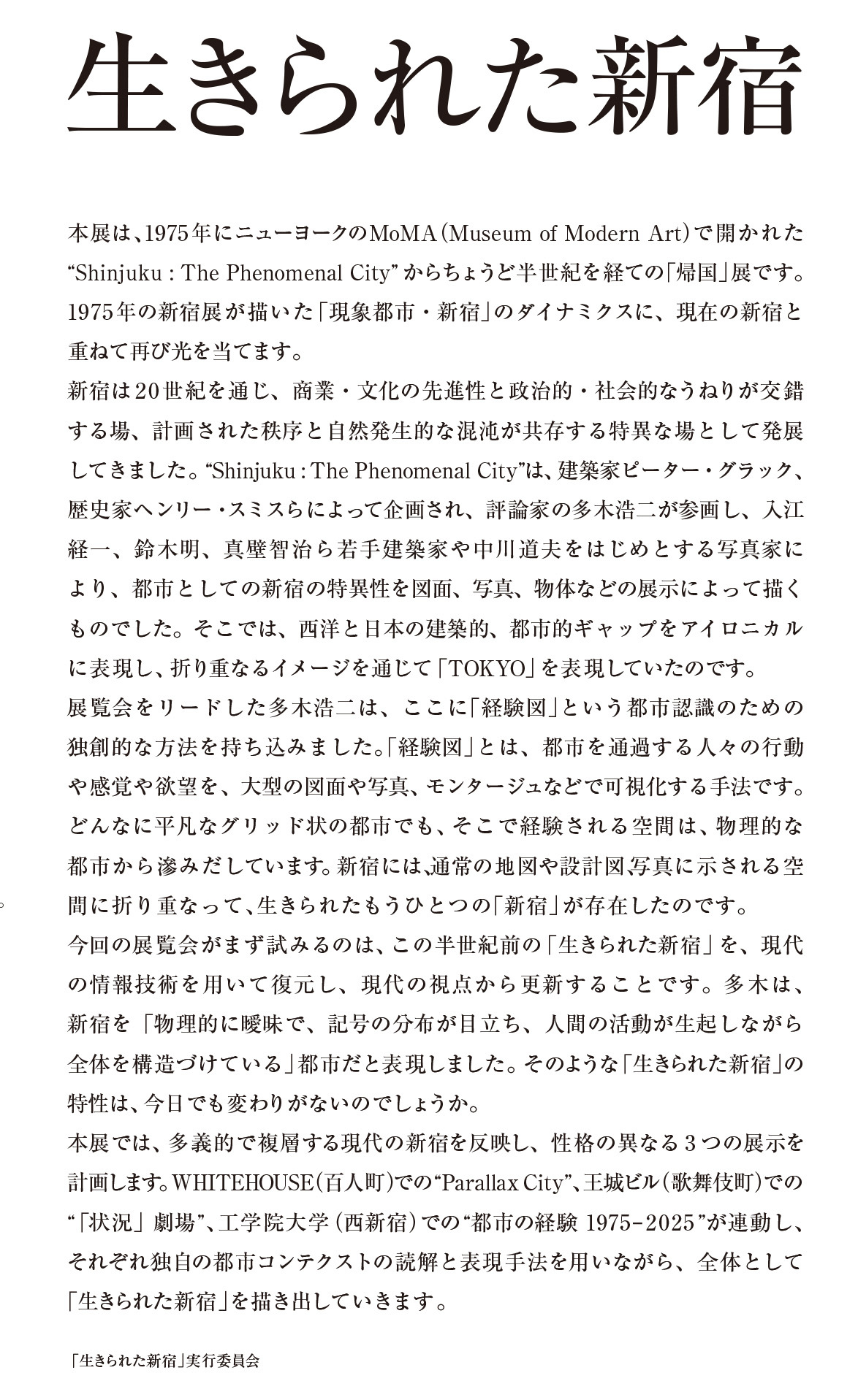 本展は、1975年にニューヨークのMoMA(Museum of Modern Art)で開かれた“Shinjuku : The Phenomenal City ” からちょうど半世紀を経ての「帰国」展として実施されます。会期中新宿エリアに3会場設置され、工学院大学新宿キャンパスが会場となる「都市の経験 1975-2025」では建築デザイン学科初田研究室、樫原研究室が展示運営に協力します。独自の都市コンテクストの読解と表現手法を用いながら、全体として「生きられた新宿」を描き出していきます。
