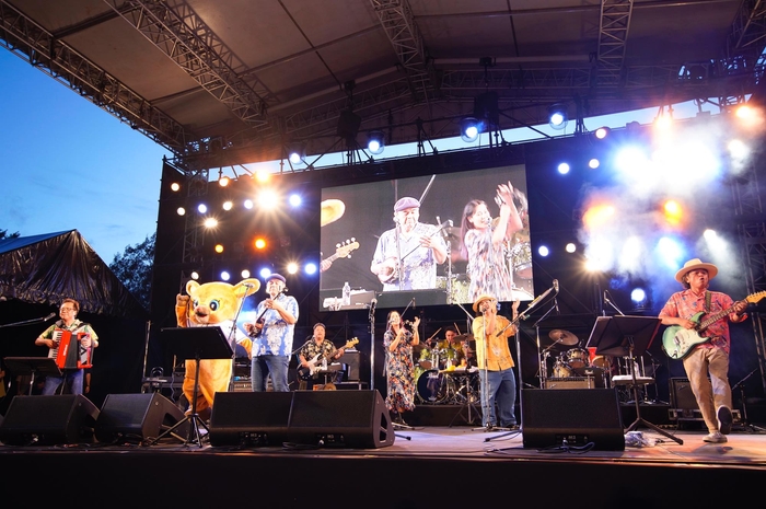 オープニングの一曲目は、うるま市との縁を伝えるために「ウルマメロディー」からはじまった。戦後、食糧不足となった沖縄に、沖縄の食文化を支える「豚」を届けてくれたのは、ハワイに住む沖縄出身の日系移民の方々だった。故郷に豚を送ろうと、ハワイのウチナーンチュたちが「恵みの歌」をつくり、ラジオで繰り返し放送し、募金を呼びかけた。結果、5万ドルという大金が集まり550頭の豚がポートランドから沖縄へと送られたという。そしてその時、船が着いた場所が、うるま市のホワイトビーチだった。そのことを知ったBEGINが、ハワイの方々への感謝を歌にしたのが、この日、オープニング曲となった「ウルマメロディー」だった。ステージには、フラのチームによる美しい踊りと、琉球國祭り太鼓のメンバーによる力強いエイサーが、歌に合わせて披露された。一曲目にして、「ここ」で行われる必然性がガチッとハマった、そんな印象を受けた、そんな「うたの日コンサート」の幕開けだった。