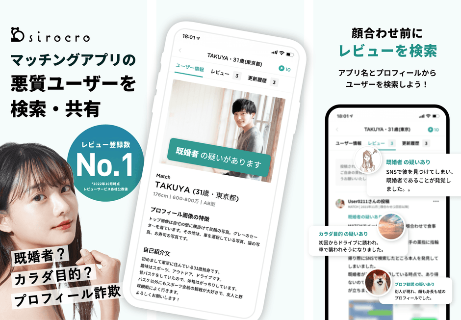 アプリをご利用いただくことで、マッチングアプリを利用するユーザーの中で、「体目的の既婚者」や「投資勧誘目的」などの利用規約に違反する悪質なユーザーを検索・共有することができます。