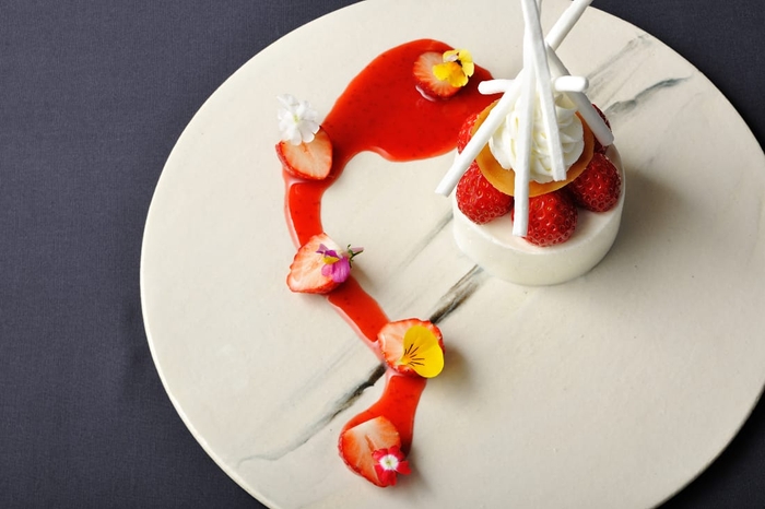 デザートは、「苺のデクリナツィオーネ(*)」を提供します。濃厚な苺のチョコレートムースの上に、苺、柚子風味のキャラメルディスク、サクサクとした食感のメレンゲスティックを重ね合わせたデザートです。苺と柚子の酸味を効かせたソースがあり、苺のチョコレートムースやクリームなどと合わせることで、甘みと酸味のバランスがとれた味わいを楽しめます。