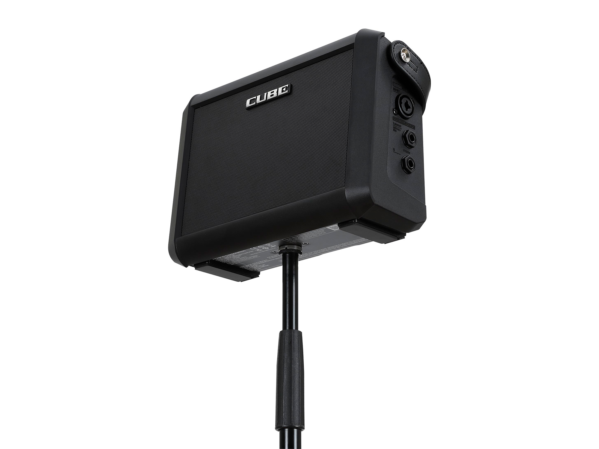 『CUBE Street MINI』は、迫力あるサウンドをもたらす2.1スピーカー・システムを採用しています。5インチのスピーカーと2つのツイーター、余裕のあるヘッドルーム設計により、クリアなサウンドを実現。本体背面にはチルト・スタンド、下部にはマイク・スタンドホルダーを装備しており、シチュエーションに合わせた最適なセッティングを行うことができます。