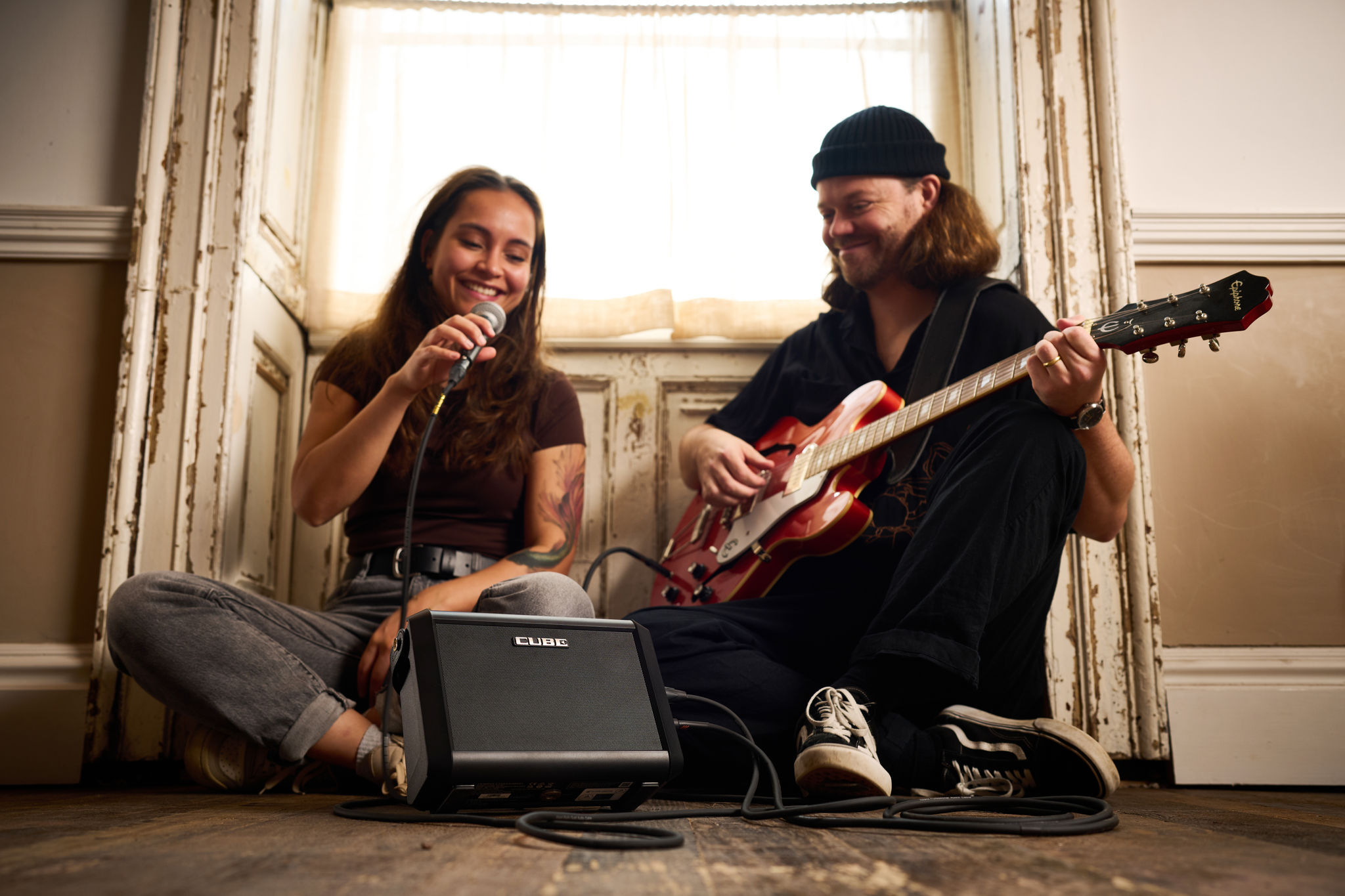 「GUITAR/MIC/INST」と「MIC」の2つのチャンネルを備えており、ボーカル・マイクとギターまたはキーボードなどとの組み合わせや、両チャンネルにマイクを接続するボーカル・デュオなど、多彩なスタイルのパフォーマンスに対応します。Bluetooth(R)オーディオの搭載により、モバイル端末からワイヤレスでバッキング・トラックを再生することも可能です。