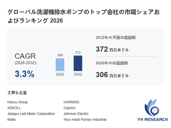 YHResearch調査チームの最新レポート「グローバル洗濯機排水ポンプのトップ会社の市場シェアおよびランキング 2026」によると、2026年の306百万米ドルから2032年には372百万米ドルに成長し、2026年から2032年の間にCAGRは3.3%になると予測されています。