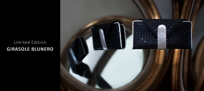 「GIRASOLE(ジラソーレ)」の一見金網のように見える連続的な模様の素材は、箔押しをした牛革に、型押しと型抜きを同時に施したブランドの人気商品です。今回の限定品「GIRASOLE BLUNERO」(ジラソーレ ブルネーロ)」ではブルーと交じり合い漆黒へと変化していくインクのようなブラックに、マットなシルバーを組み合わせました。いつでも新しい顔を見せてくれるベストセラー「ジラソーレ」の限定色を今年もお楽しみください。