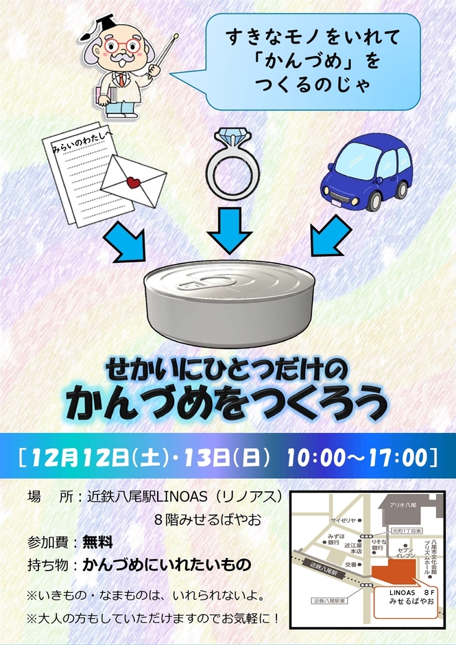 12月12日、13日は近鉄八尾駅すぐのショッピングモール「LINOAS(リノアス)」8階にて、好きなものを自由に入れていただき思い出を缶詰する『缶詰製造体験イベント』を無料で実施します。