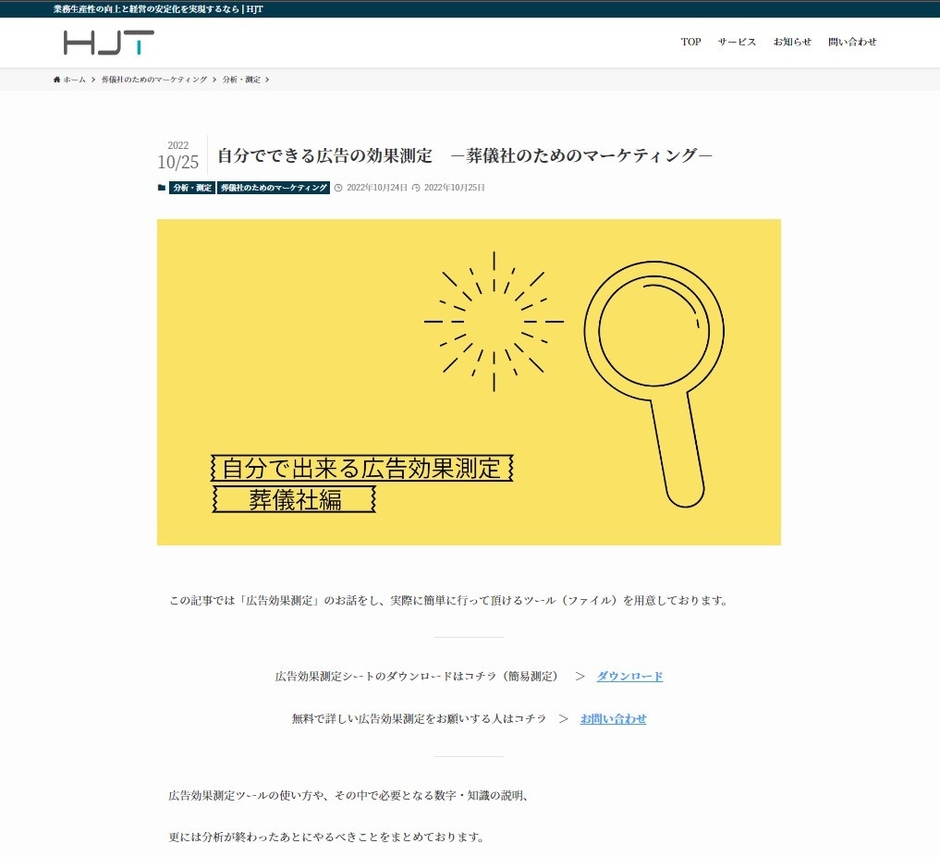 株式会社HJT(所在地:東京都千代田区五番町6-2、以下 HJT)は、葬儀社向けに無料広告効果測定を11月1日より提供いたします。