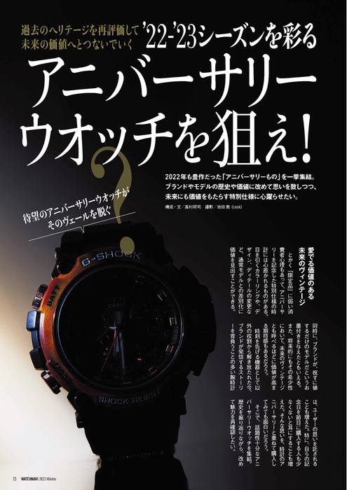 大きな節目を記念して製作された「アニバーサリーウオッチ」は、いつの時代も注目の的。2022年にアニバーサリーを迎えたナビタイマーやロイヤル オークなどのモデルチェンジや、チューダー「レンジャー」のように歴史的な節目を迎えて誕生した新作などの開発背景に年跨ぎで迫ります。G-SHOCKの40周年、ブランパン「フィフティ ファゾムス」70周年ほか、2023年に節目を迎える注目モデルもピックアップ!