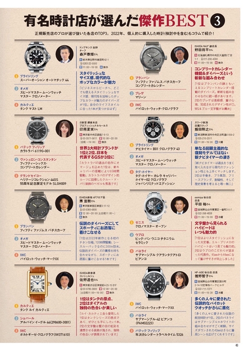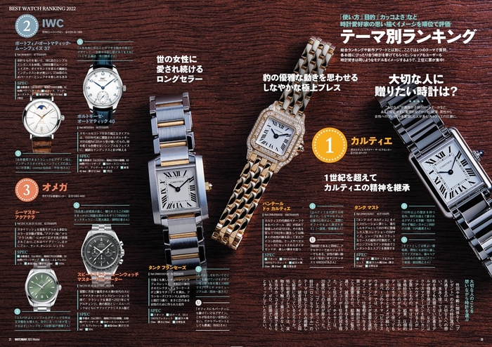 巻頭特集はショップとユーザーに協力いただき、2022年のベストウオッチを選出する毎年恒例のランキング特集です。表紙も飾ったブライトリングとIWCの一騎打ち、総合ランキングの接戦を制したのは果たして!? さらに2022年発表モデルに限定してベストウオッチ賞やサプライズ賞などを決定する「新作アワード」や、プレゼントしたい時計やビジネスウオッチといえば? といった「テーマ別ランキング」など、多角的に腕時計を順位付けしました。これを読めば国内の時計販売のトレンドが丸わかり!