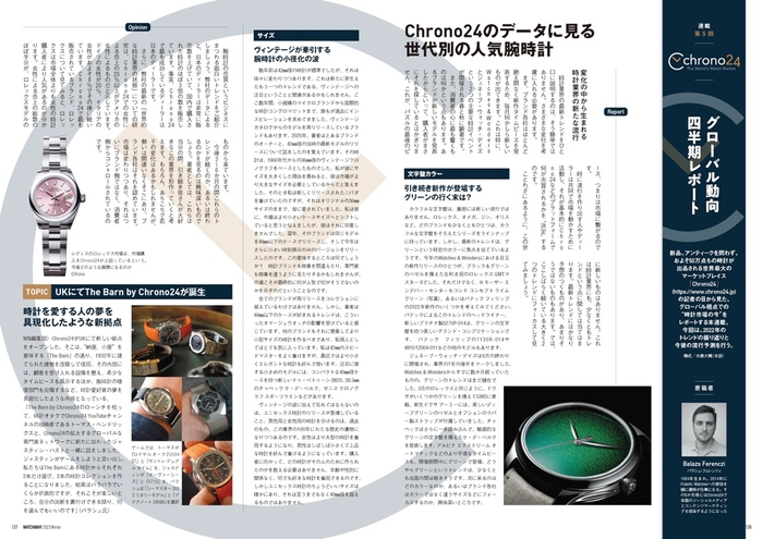 スタジオ ブライトリングの技術者に協力してもらい、ブライトリングの自社製とエボーシュベースの自動巻きクロノグラフキャリバー2種と、自社製手巻きクロノグラフキャリバー1種の機構を徹底解説しました。「次代を担う21世紀のブランド」では、リシャール ミルの誕生で幕を開けた新時代の時計業界について、2001年以降に創業したブランドのみを取り上げながら改めて考察しています。4名の時計カメラマンにより写真作品連載に、日本の著名な修理技術者と営業マンとの対話連載、専門学校の学生が1年がかりで制作する時計の完成までを追うドキュメンタリー連載など、今号も大充実の内容でお届けです。