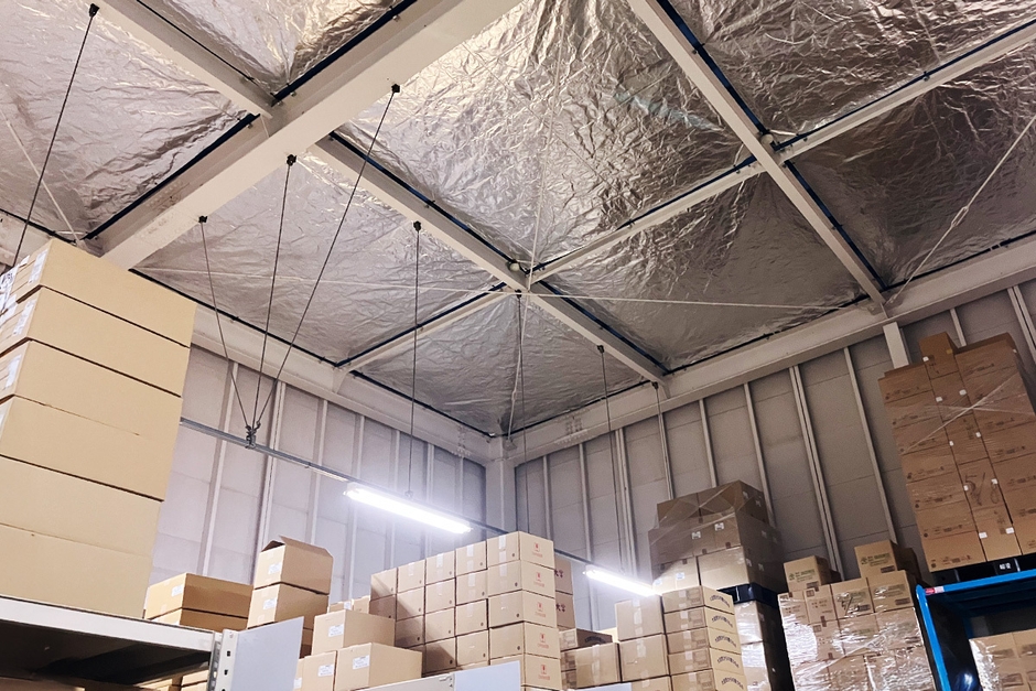 天井から床に降り注ぐ輻射熱が荷物を熱し、そこから発生する熱で室温がさらに上がる「二次加熱」も、遮熱レスキューが遮断。作業環境を快適に保つと同時に、保管中の荷物の品質維持にもつながります。