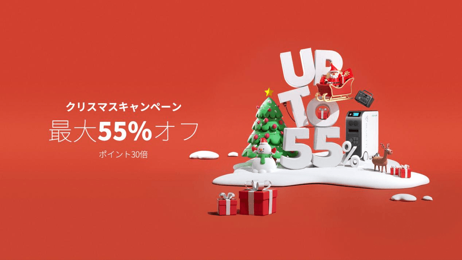 クリスマスキャンペーン期間中、BLUETTI公式サイトにおいて、一部人気商品が最大55%オフで購入できます。また、一定額以上ご購入いただくと、金額に合わせたプレゼントをご用意しています。