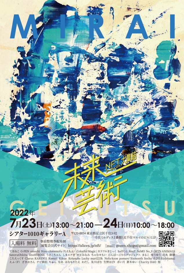 NFTアーティストが一堂に会するグループ展『【未来芸術】NFTアーティスト大集結』(主催:御膳)を2022年7月23日、24日に東京都・北千住のシアター1010ギャラリーAで開催します。