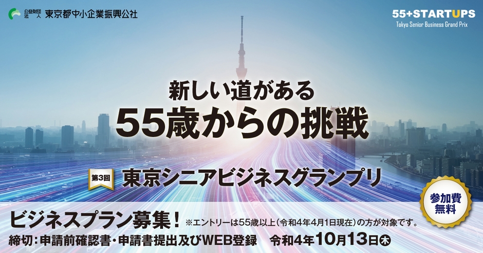 公益財団法人東京都中小企業振興公社(所在地:東京都千代田区、理事長:目黒 克昭)は、シニア層の働き方や人生設計をより豊かにするための、シニア世代の起業を後押しすることを目的に、55歳以上を対象としたビジネスプランコンテスト「第3回 東京シニアビジネスグランプリ」を開催いたします。