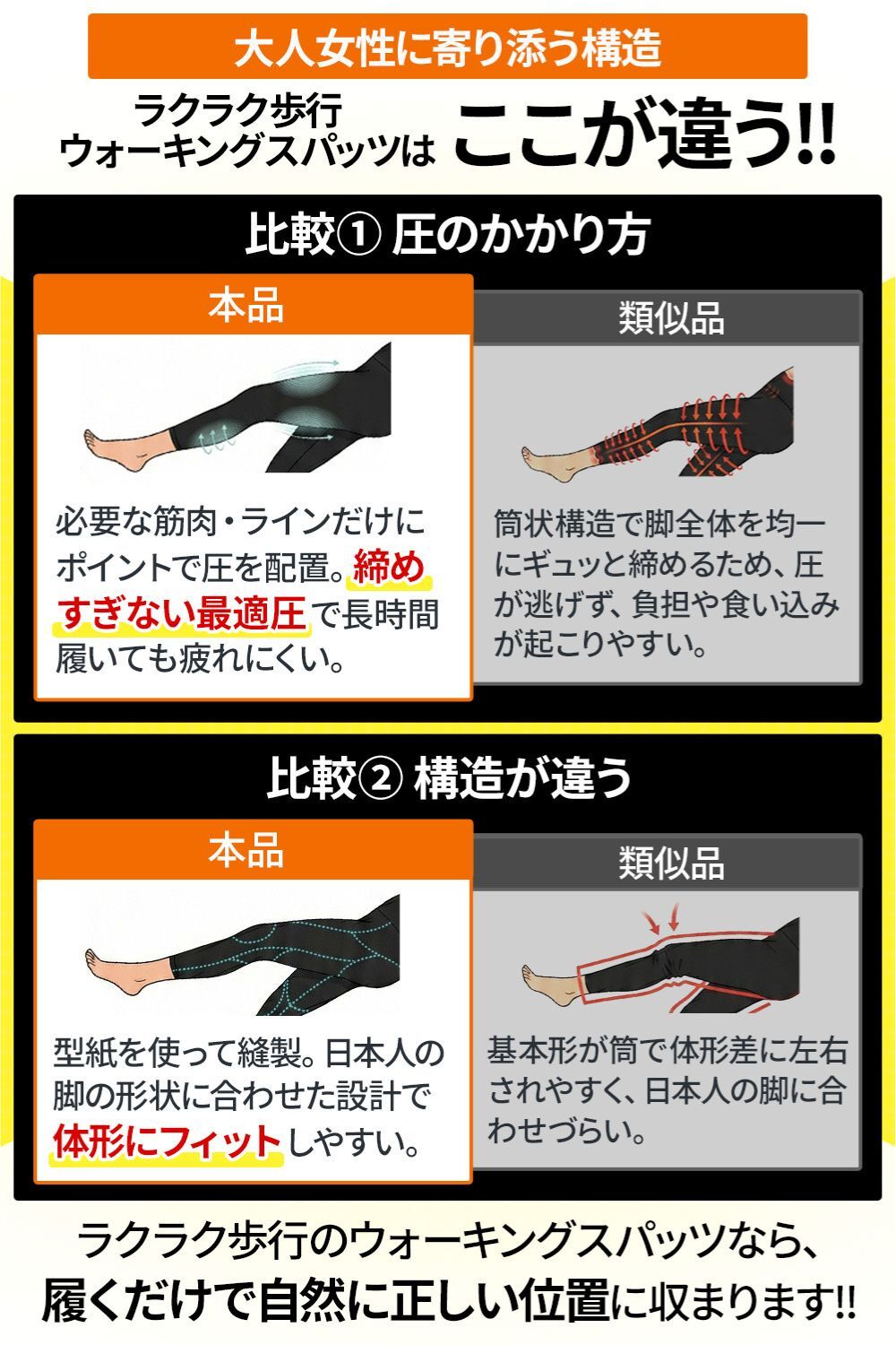 ラクラク歩行のスパッツは、強い締め付けによる矯正や加圧を目的としていません。
