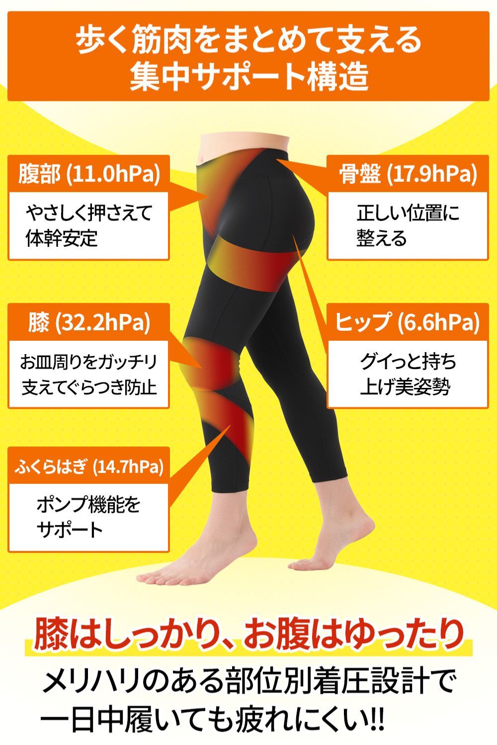 単に脚全体を締め付けるのではなく、歩行時に負担がかかりやすい部位を点で支える設計としています。